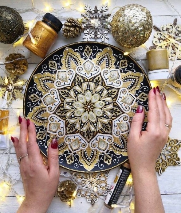 Примеры украшения тарелок в технике точечной росписи