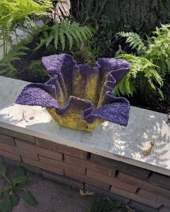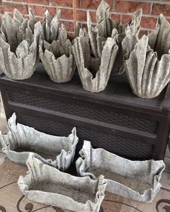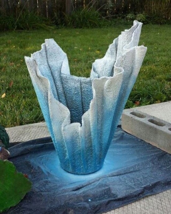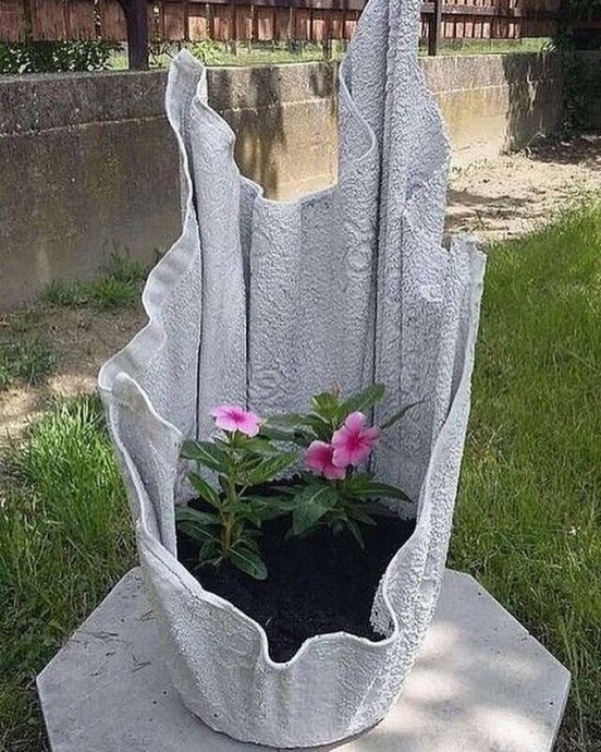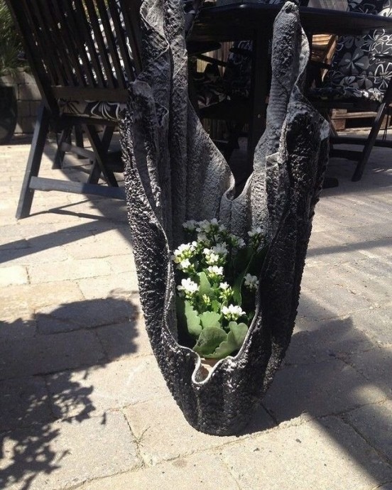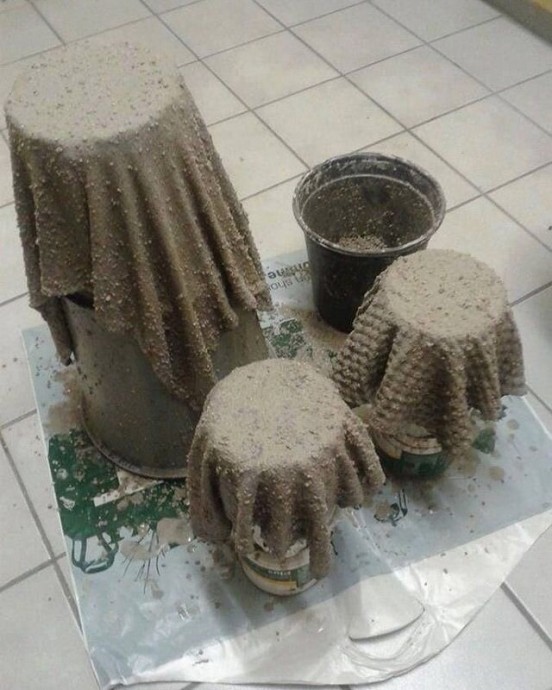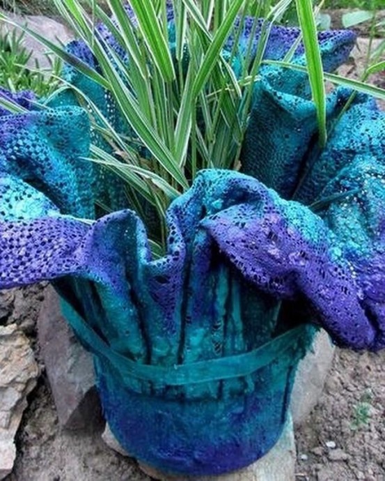 Если макать в цемент ткань с интересной фактурой, то горшки получатся еще красивее и оригинальнее.