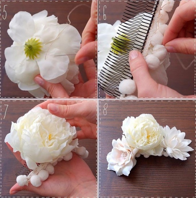 Самый большой цветок пришейте к гребню, захватывая несколько лепестков и тесьму с помпонами (фото 5, 6 и 7).