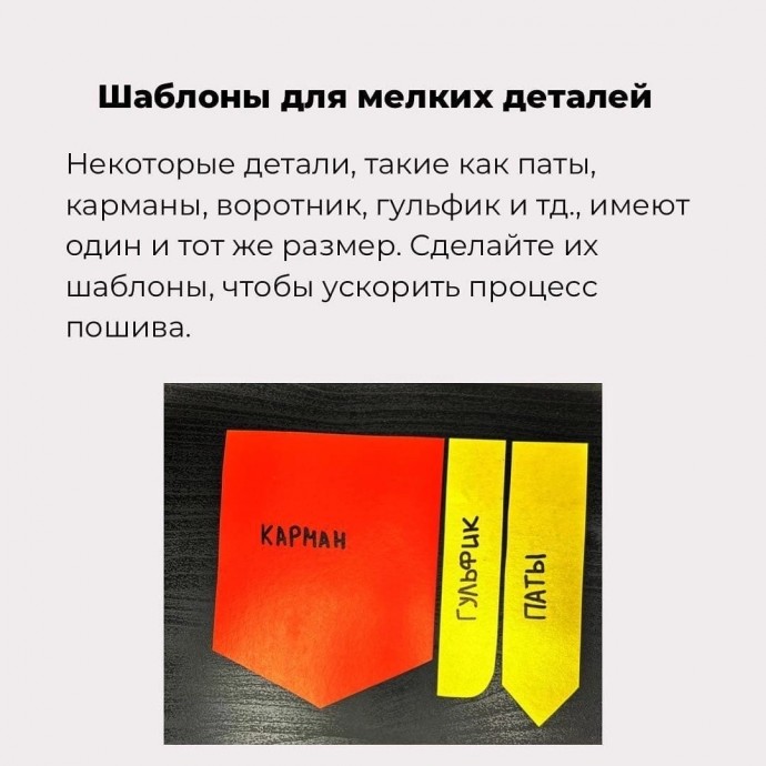 3. Делать шаблоны лекал из картона.Например, воротники, карманы, манжеты, пояса: такие детали очень часто повторяются и имеют одинаковую форму. (Какие шаблоны я использую смотрите в фото).