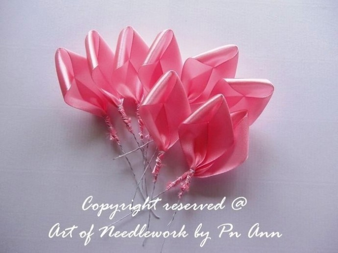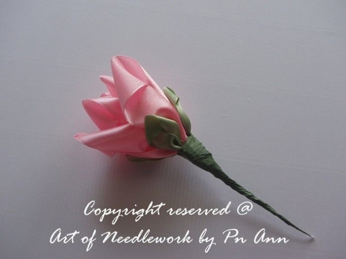 Милый цветочек из лент изготавливается на основе проволоки и может использоваться и в композициях, и как бутоньерка жениха.