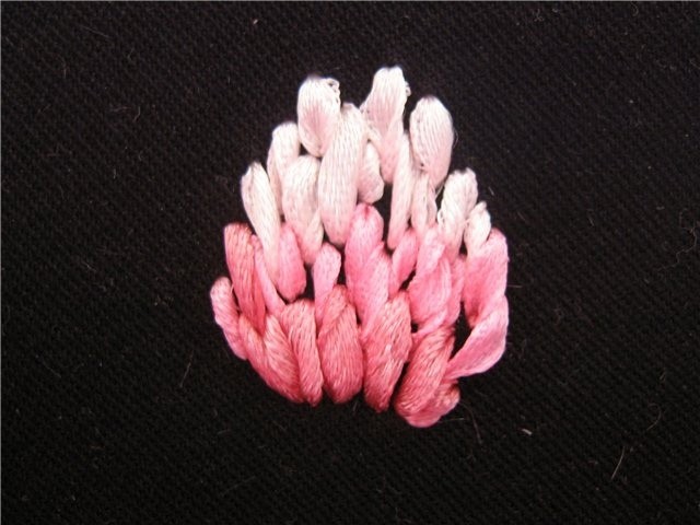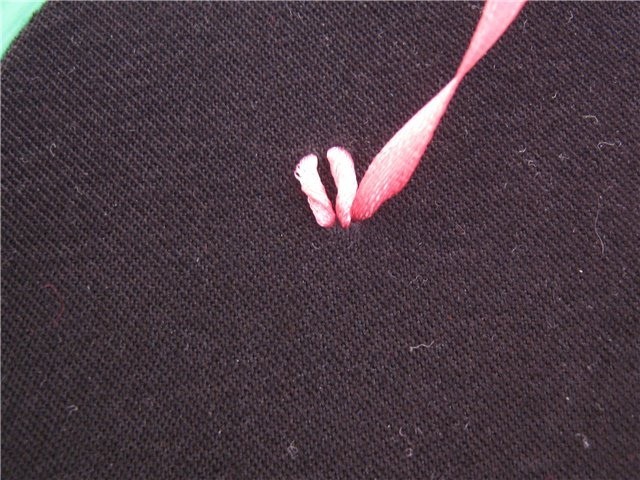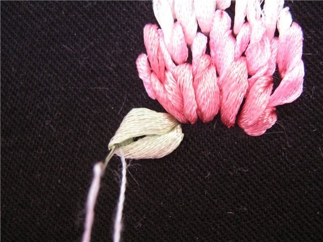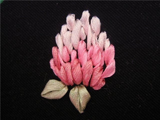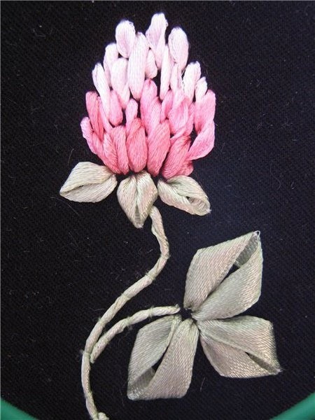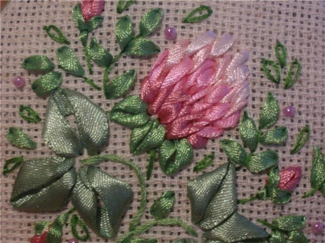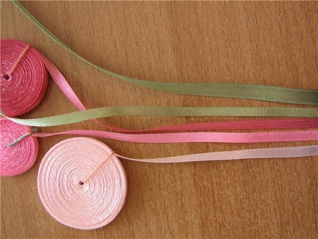 Для вышивки клевера вам понадобятся атласные ленты трех оттенков розового цвета и двух оттенков зеленого.