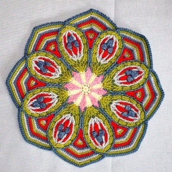 Необычные мотивы крючком с наложенным слоем могут быть использованы как подставки под горячее.