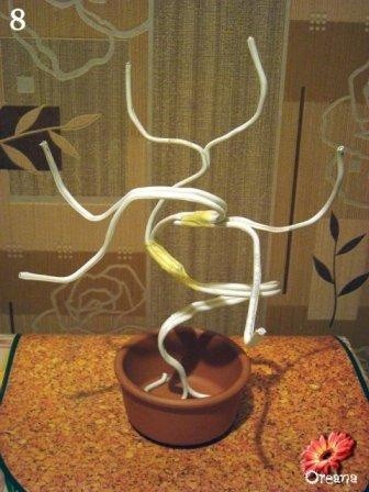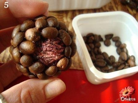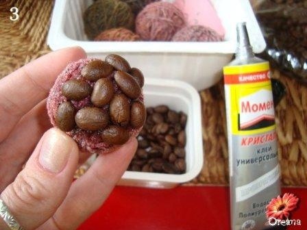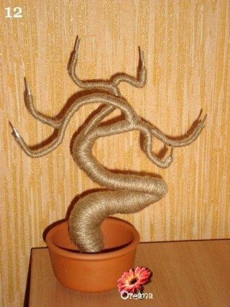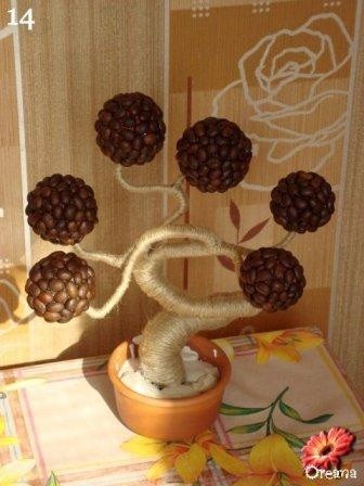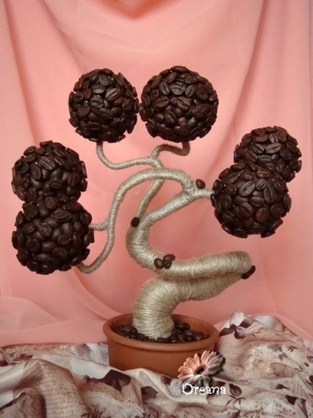 Поскольку готовых заготовок для шариков у меня нет, основы для кофейных шариков пришлось делать из небольших кусочков пенопласта, обмотанных до ровных шариков мягкими нитками из старого распущенного свитера. Обклеиваем каждый шарик первым слоем кофейных зерен, оставляя небольшое место незаполненным – для насаживания на будущий ствол. Далее начинаем придумывать ствол для баобаба бонсайного типа. У меня в роли проволочного каркаса – электрический трехжильный алюминиевый провод в оплетке. (Очень люблю этот провод в работе – низ ветвей или ствола можно оставить из трех жил, а выше к кроне разрезать в нужных местах и сформировать ветви и сучки). Отрезаем нужные кусочки, изгибаем по желанию, отдельные ветви крепим к основному стволу малярным скотчем, постоянно примеряя конструкцию к выбранному горшочку. Подрезаем ветви на предполагаемой высоте плоскогубцами и снимаем оплетку на глубину посадки кофейных шариков. И затем весь каркас маскируется путем обмотки небольшими кусочками малярного скотча для придания ровности стволу и веточкам. Когда ствол готов, начинаем обматывать его льняным шнуром, для пущей прочности можно фиксировать обмотку несколькими капельками суперклея. Ствол уже имеет полностью льняной вид – можем насаживать на каркас кофейные шарики и доклеивать зернышки в нижней части. Усаживаем наш баобаб в приготовленную посудину и заливаем гипсовой смесью. После высыхания поверхность «грунта» декорируем всем, чем Вашей творческой душе угодно И далее следует окончательная отделка кофейных шариков – приклеиваем второй слой зерен. Признаюсь, процесс требует усидчивости и некоторой ювелирной точности посадки зернышек на неровный первый слой. И – ура – наш кофейный баобаб готов