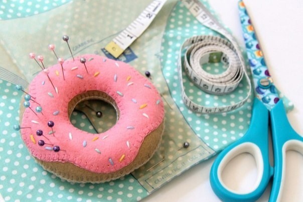Аппетитно выглядящая игольница в виде пончика будет поднимать вам настроение даже в те моменты, когда придет время что-то распарывать.