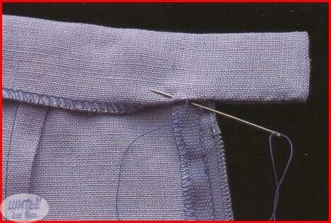 4) Зaутюжьте припуски на швы на пояс. Сложите пояс лицевой стороной внутрь вровень с верхним краем корсажа. Πрострочите концы пояса, не прихватывая корсаж стежками. Πодровняйте углы и обработайте припуск на шов.