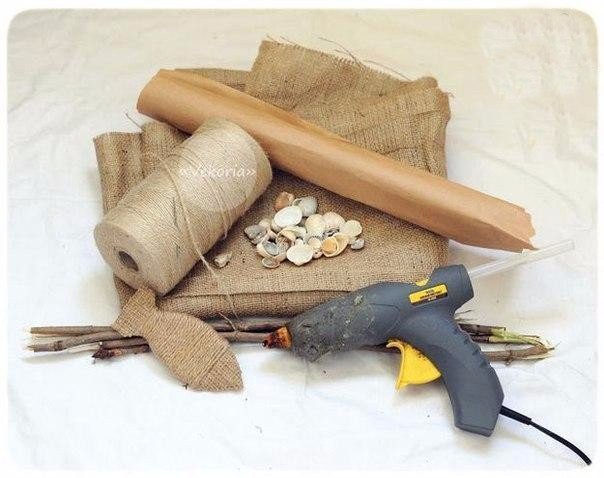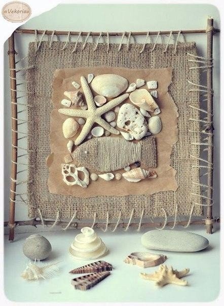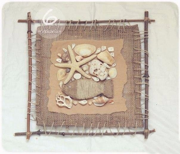 Панно в морском стиле изготавливается на основе мешковины и джутового шпагата с использованием даров моря.
