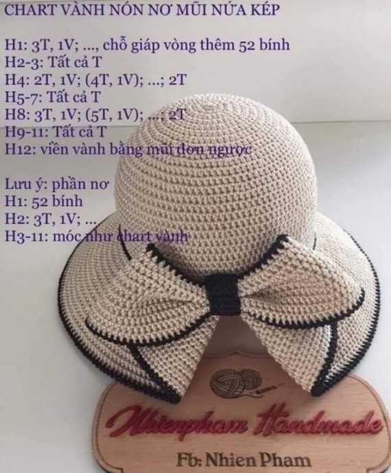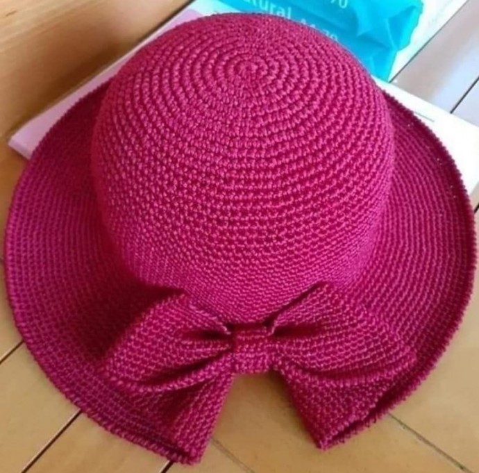 Летняя шляпка с бантом сзади связана плотно, поэтому пряжу лучше использовать натуральную и дышащую.