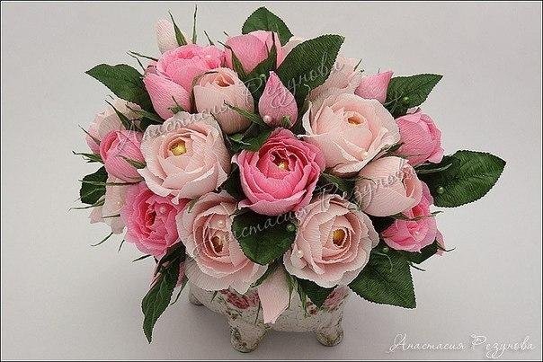 Букет цветов с секретом в виде сладостей можно расположить на праздничном столе или подарить подруге.