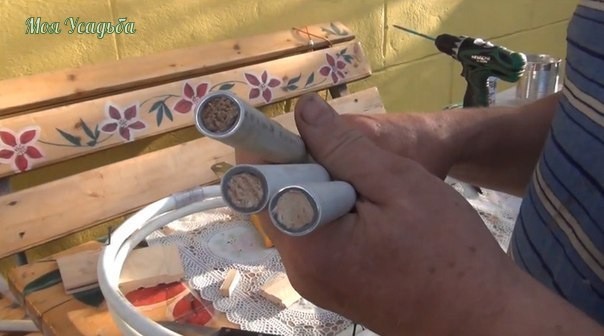 Подготовьте деревянные чёпики и вбейте их в обрезки трубы. Потребуется три таких трубы.о