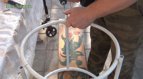 Соединяем низ Завершающим этапом соедините ножки конструкции со вторым кольцом. На этот раз саморезы можно вкрутить в горизонтальной плоскости. Такая конструкция будет очень устойчивой.