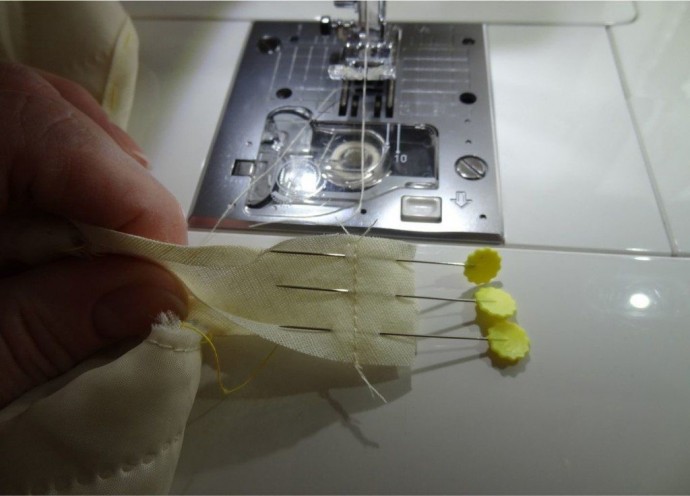 3. Сколоть булавками концы бейки лицевыми сторонами сначала по центру, а затем отогнуть заутюженные припуски и тоже сколоть