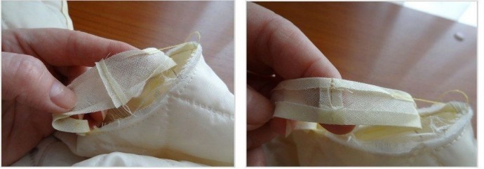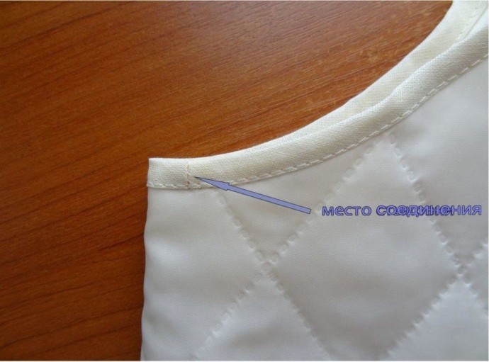 При обработке замкнутых срезов и краев изделия, возникает необходимость соединить "в кольцо" края косой бейки. Как это сделать показано на примере обработки проймы у подстежки пальто.