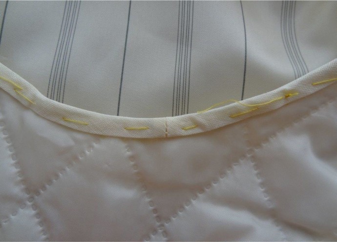 7. Приметать соединенную косою бейку к открытому срезу проймы