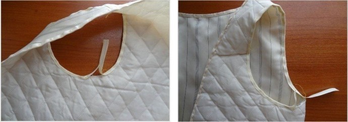 1. Приметать косую бейку к срезу проймы, оставив открытыми концы бейки с обеих сторон. Длина бейки должна быть больше длины проймы приблизительно на 5-10 см.
