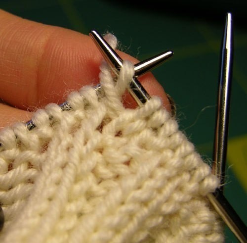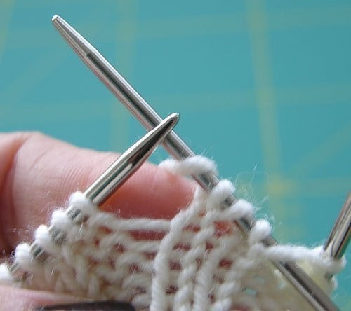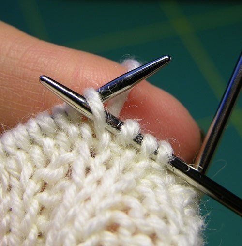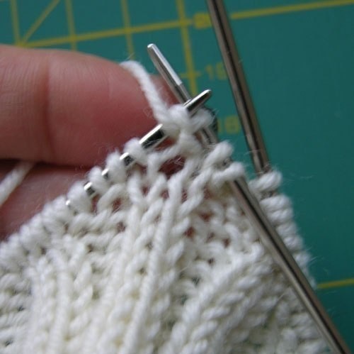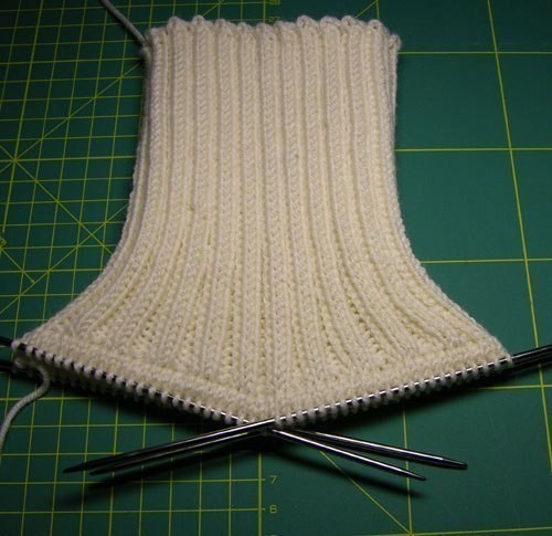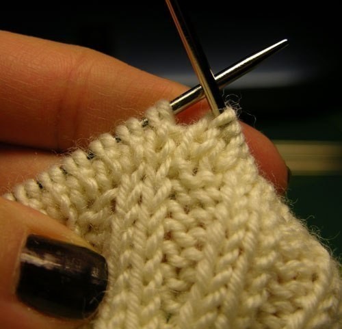 14.Шестой ряд полой резинки Переходим на чулочные спицы № 3.0. Провязываем вместе изнаночные и лицевые петли, захватывая обе петли со стороны лицевой