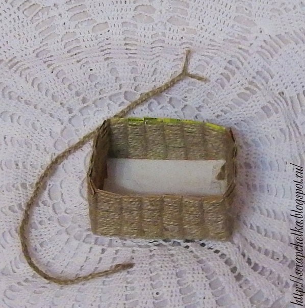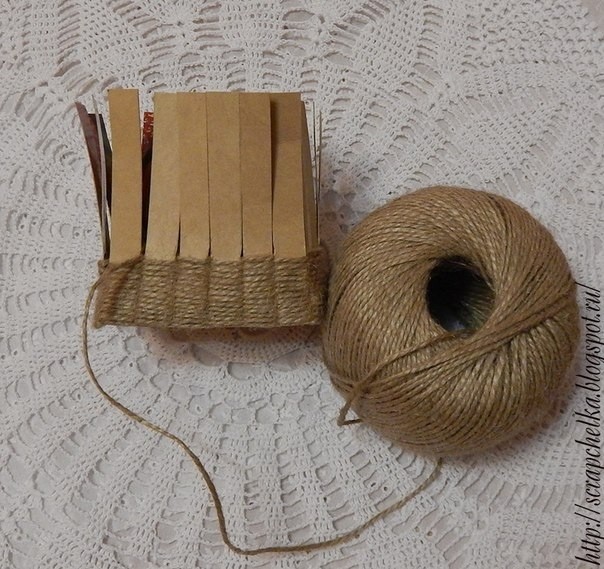Берём бечевку (эко-стиль приветствует её) и начинаем переплетать ,кончик закрепляем на двусторонний скотч, можно с помощью горячего пистолета.