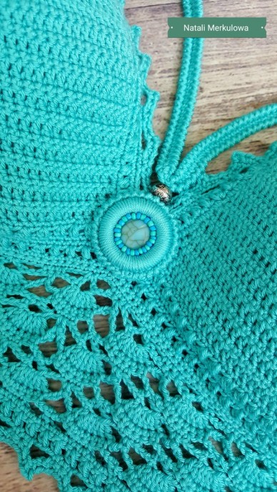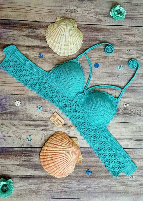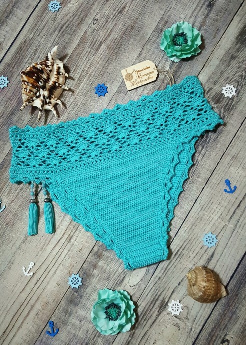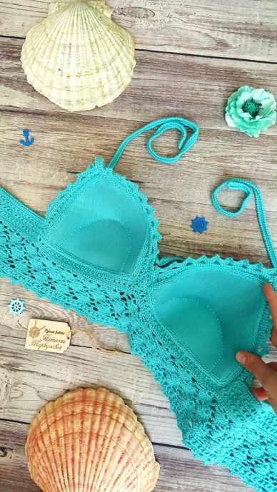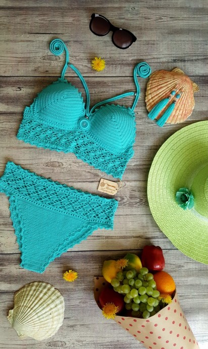 Восхитительный вязаный купальник может быть как из натуральной пряжи (хлопок), так и из быстросохнущей синтетической.