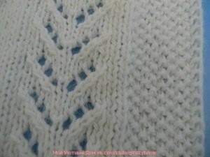 Дальше вязала так: кром, 9 пет риса, 2 лиц, 1 изн, 9 пет ажурного узора, 1 изн, 116 пет лицевой глади, 1 изн, 9 пет ажура, 1 изн, 2 лиц, 9 пет риса, кром.