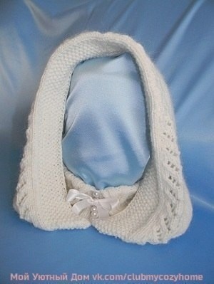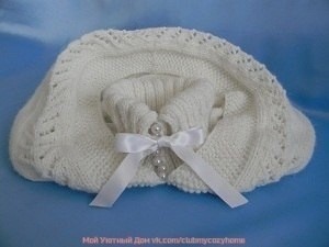Для резинки 2х2 набрала 82 петли и провязала 12 рядов, затем ряд – накид, 2 вместе лицевой – дырочки для ленточки.