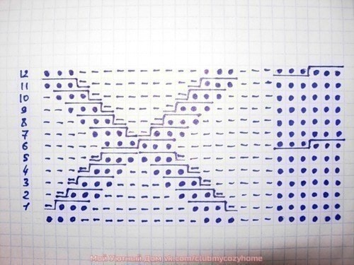 Потом нашла две средних петли и от них в каждом лицевом ряду с каждой стороны провязала 9 раз по 2 петли вместе.
