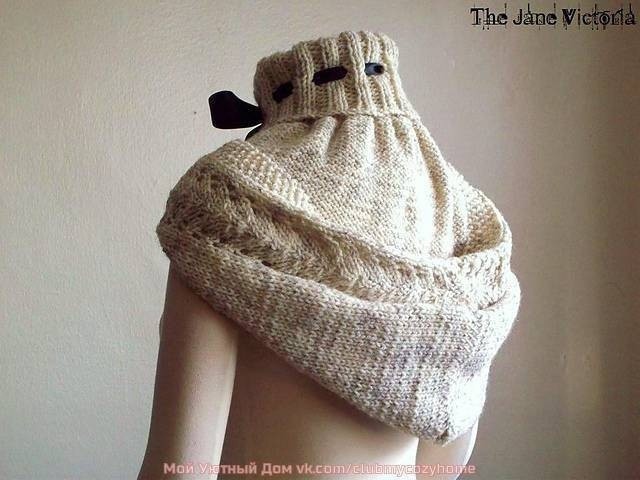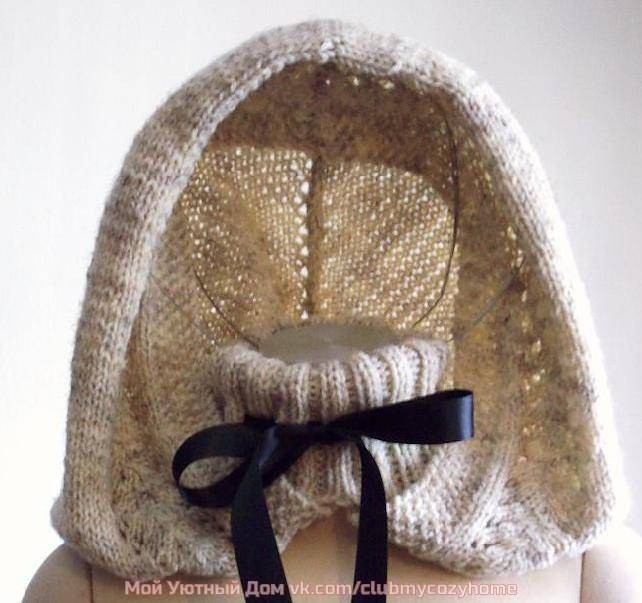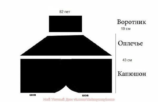 Всего высота капюшона от резинки 43 см, но я вязала на себя, а у меня голова немаленькая и волосы я наверх зачесываю.