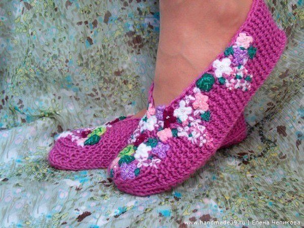 Тапочки на двух спицах "Сирень" отличаются особой красотой благодаря вышивке.