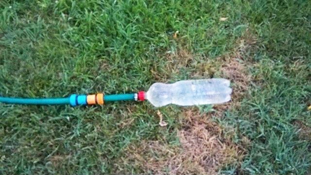 Распылитель воды для сада легко сделать, используя как насадку на шланг пластиковую бутылку, в которой предварительно сделаны отверстия.
