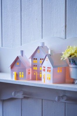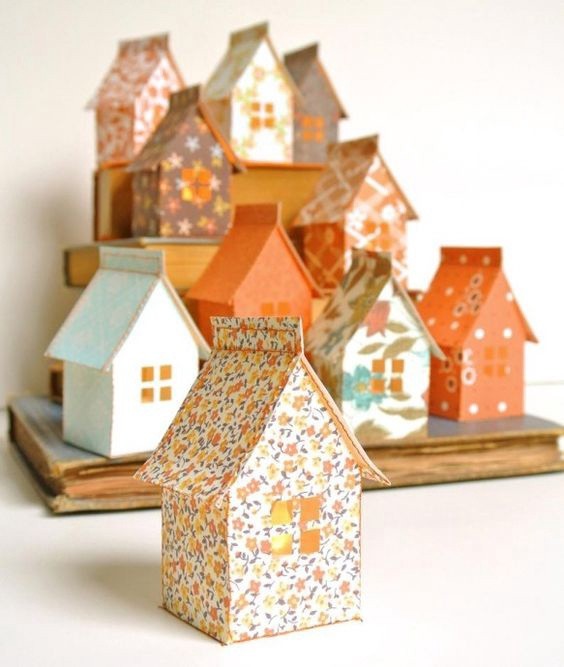 Декоративные домики из бумаги можно поставить, подсветив изнутри свечами на батарейках.