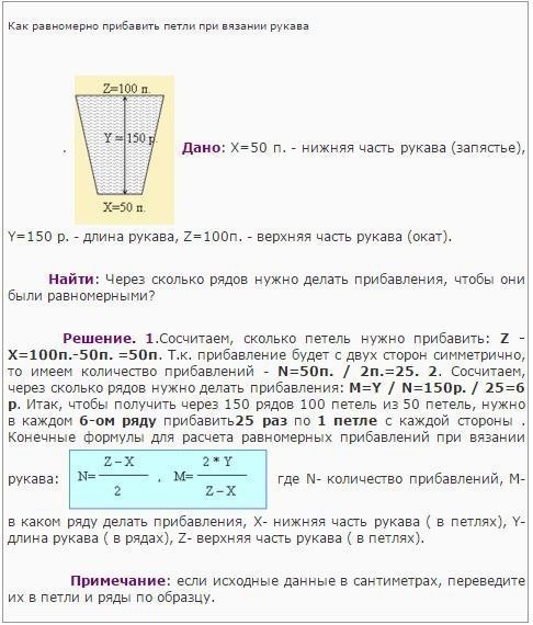 Формула равномерного прибавления петель при вязании рукава Дано: X=50 п. - нижняя часть рукава (запястье), Y=150 р. - длина рукава, Z=100п. - верхняя часть рукава (окат).Найти: Через сколько рядов нужно делать прибавления, чтобы они были равномерными?