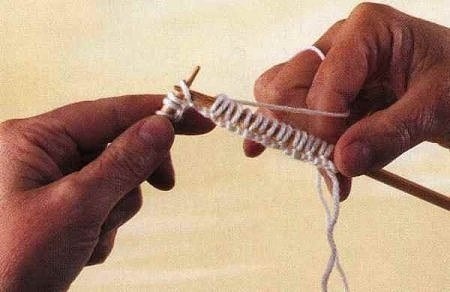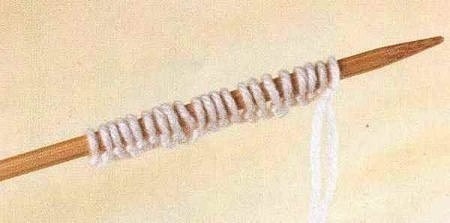 Наберите нужное (нечётное) количество петель. Следите за натяжением нити - петли должны быть одного размера, а узелки должны собраться под спицей в ровную линию.