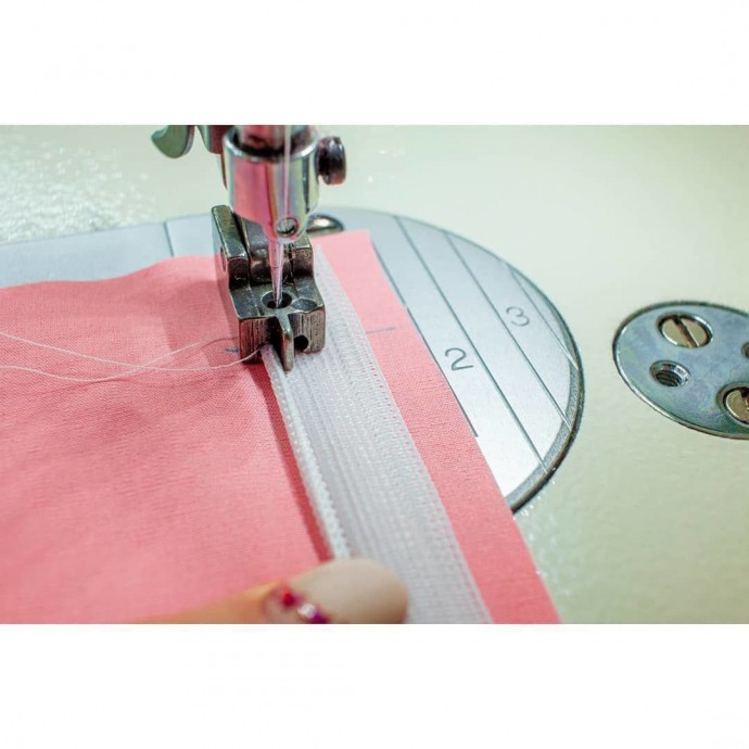 2) Прикладываем половинку молнии ограничителем на 2 мм ниже линии разметки. 3) Отгибаем "змейку", опускаем иглу и после неё лапку, зажимая зубчики в отверстии лапки.