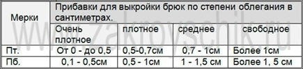 При расчетах некоторых стандартных формул для данного вида поясного изделия используют припуски на свободное облегание. В нашем примере используются средние прибавки, которые используются при высчитывании формул по участкам линии талии (Пт) = 1см и бедер (Пб) = 1см. Если вам необходимо выкроить изделие по свободнее или наоборот более прилегающее применяют соответственные прибавки. Для образца предложена таблица 2 прибавок по степени облегания джинсовых брюк.