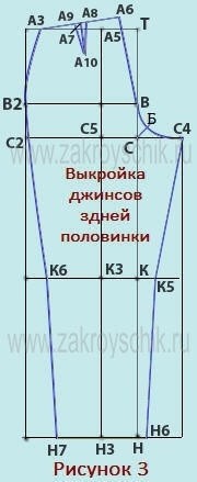 А7 А9 = А7 А8 = 1 см. Ширина по линии низа задней половинки выкройки джинсовых брюк.