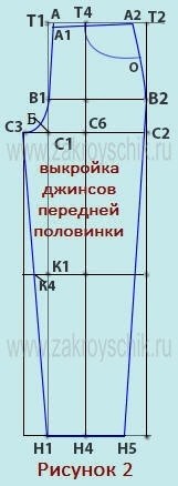Проводим линию банта передней половинки через по буквам А1, В1, Б, С3. Если застежка находится по центру изделия можно построить от прямой А1 В1 цельнокроеный припуск на застежку на шириной 3 - 4см, а на длиной 20 - 22 см. Ширина по линии низа, выкройки джинсов передней половинки.