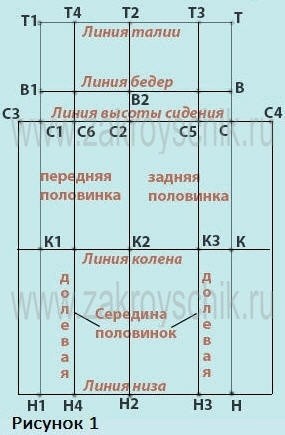 Из точки В1 начертим в противоположные направления вертикальные линии до пересечения с горизонтальными линиями талии и низа. Пересечение прямых отмечаем как показано на рисунке 1 точками Т1, С1, К1, Н1. Передняя половинка сетки.