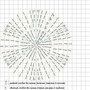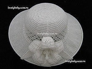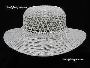 Вяжется сверху. Я вязала столбиками с накидом и делала 12 клиньев, по две прибавки в каждом клине через ряд. Если очень волнится, можно уменьшить кол-во клиньев. Дальше вяжем этим рисунком только вместо двух воздушных петель между ст.с.н я вязала одну воздушную, вместо 5воздушных - 3. Раппорт рисунка в моем случае равен 6 петель. Начинала со второго ряда схемы. После рисунка, вяжем отделочную полосу для ленточки. Я вязала два ряда *ст.б.н, воздушная*, во втором ряду ст.б.н вязать над воздушной предыдущего ряда. Ряд столбиков с накидом (можно с 2-3 накидами, для широкой ленточки), и еще два ряда *ст.б.н, воздушная*. Поля вязала ст.с.накидом (глубоким вкалыванием), 24 клина, по одной прибавке на клин. Прибавки делала через ряд. последние 5 рядов вязала без прибавок, увеличивая номер крючка. Но можно вязать тем же крючком и с прибавками до самого конца. В край ввязала регилин, у меня на 4 жилки, сложила его пополам, скрутила в кольцо по размеру полей, и обвязала ст.б.н захватывая последний ряд шляпки между ст.с.н.