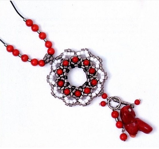 Материал необходимый для украшения: - бусины красного цвета - бисер «рубка» металлик - бисер «рубка» серебристый - бисер «рубка» черного цвета - «рубка» белого цвета - различный материал для подвески - черный шнурок с застежкой - капроновая нить
