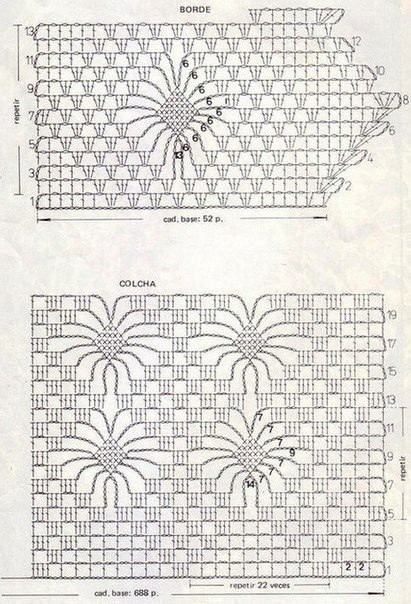 Вяжем основную часть по нижней схеме, затем кайму по верхней схеме, соединяем и получаем шикарное покрывало.