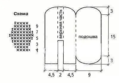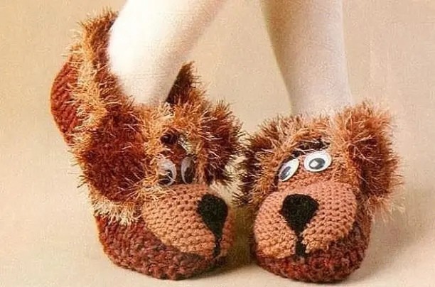 Начинайте вязать с подошвы. На спицы темно-коричневой нитью в 2 сложения наберите 26 п. и вяжите платочной вязкой, прибавляя с обеих сторон в каждом 2-м ряду 6 раз х 1 п. = 38 п. Затем провяжите 4 ряда без прибавлений, после этого убавьте с обеих сторон в каждом 2-м ряду 6 раз х 1 п. = 26 п. Далее вяжите спицами верхнюю часть. Для этого наберите на спицу дополнительно 7 п. (продолжение подошвы), поверните работу. Вяжите получившиеся 33 п., в конце ряда прибавьте еще 1 п. Далее с этого края прибавьте в каждом 2-м ряду еще 5 раз х 1 п. (как на подошве тапочек). Провяжите 12 рядов прямо. Затем закройте 20 п. со стороны пятки, оставшиеся петли вяжите спицами платочной вязкой еще 6 рядов прямо. Затем начинайте убавлять со стороны мыска в каждом 2-м ряду 6 раз х 1 п. После этого со стороны пятки снова наберите 20 п. и вяжите еще 12 рядов резинкой 1x1. Закройте петли. Выполните шов. Ушки: пряжей «Травка» темно-коричневого цвета обвяжите тапочек крючком 5 рядами ст. б/н. В следующем ряду, провязав боковую часть и дойдя до линии сгиба, добавьте 1 нить коричневого цвета и вяжите ушко столбиками б/н по схеме. Провязав 10 рядов полустолбиками, вернитесь к передней части изделия, провяжите 3 ст. б/н и выполните второе ушко аналогично. Затем ушки и боковую часть обвяжите 1 рядом ст. б/н нитью «Травка» светло-коричневого цвета. Мордочка: нитью «Каролина» в 2 сложения наберите 16 п., вяжите спицами платочной вязкой 2 ряда прямо. Затем прибавьте с обеих сторон в каждом 2-м ряду 2 раза х 1 п. = 20 п. Провяжите 18 рядов без прибавлений, затем убавьте с обеих сторон в каждом 2-м ряду 4 раза х 1 п. Провяжите еще 18 рядов прямо и закройте петли. Обвяжите деталь по всему периметру 1 рядом ст. б/н. Затем провяжите еще 1 ряд ст. б/н, пропуская каждый 2-й ст. предыдущего ряда, чтобы мордочка стянулась. Носик: черной нитью в 2 сложения наберите цепочку из 3 возд. п., замкните в кольцо. Ввяжите 6 ст. б/н в кольцо. Далее вяжите по кругу столбиками б/н, равномерно прибавляя по 6 ст. в каждом ряду. Когда получится круг диаметром 3 см, стяните деталь по краям, набив синтепоном. Сборка деталей вязаных тапочек: мордочку пришейте узкой частью между ушками, слегка наполнив синтепоном. Широкую часть также наполните синтепоном, пришейте. Пришейте носик на мордочку. Пришейте или приклейте глазки.