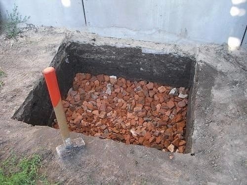 Под фундамент роем котлован по периметру крыльца глубиной 50 см. Засыпаем 20 см щебня или боя кирпича. Сверху засыпаем 10 см песка, трамбуем его и проливаем водой.