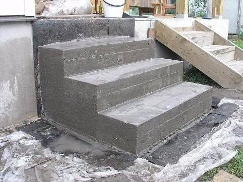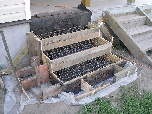Теперь можно переходить к непосредственному заливанию бетона. Укладывать его лучше сразу же после извлечения из бетономешалки, если есть возможность разместить ее радом с возводимым крыльцом. Раскладывать бетонную смесь следует с нижнего яруса, постепенно доходя до самой высокой ступени. Раствор должен слегка утрамбовываться, чтобы в последствии не допустить образование пустот. Снимать опалубку можно только после полного застывания готовых ступеней, не ранее чем через 7 дней.