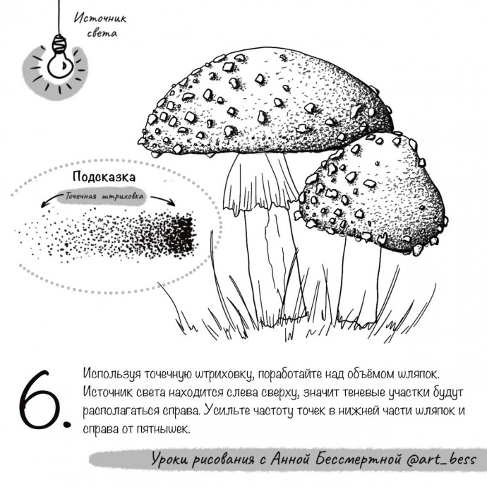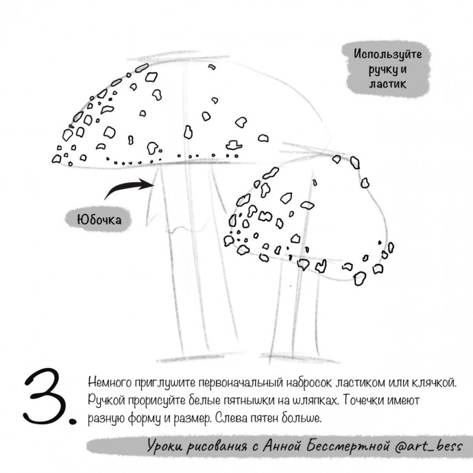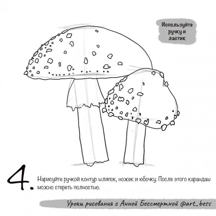 Простым карандашом или ручкой можно нарисовать мухоморы с кажущимися объёмными пупырышками.
