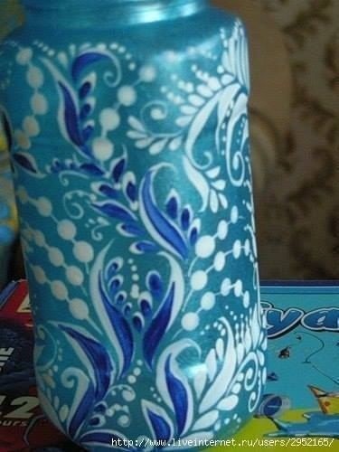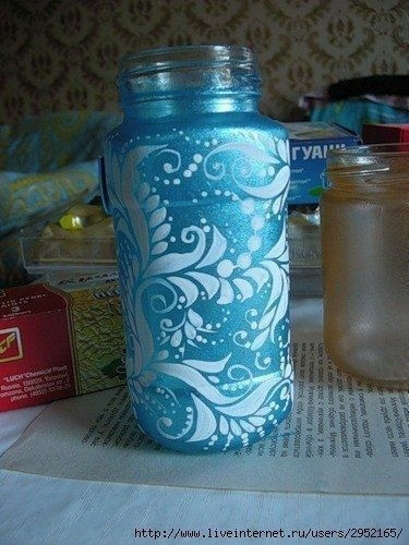 4. На хорошо просохшую баночку наносим гуашью основной рисунок. Рисунок произвольный как подсказывает личная фантазия…
