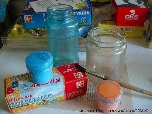 1. Грунтуем протравленные растворителем баночки акриловыми красками одним слоем