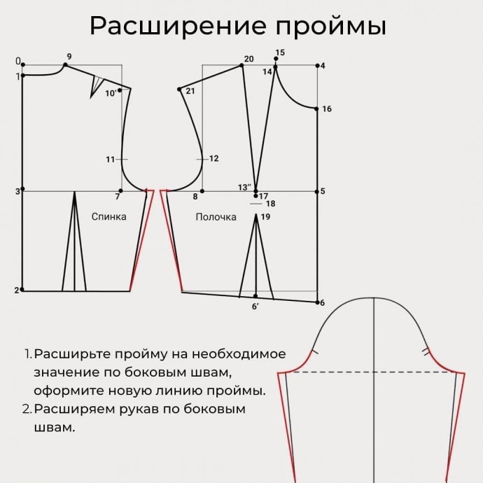 Если вы расширяете пройму по боковым швам, вам необходимо расширить рукав.
