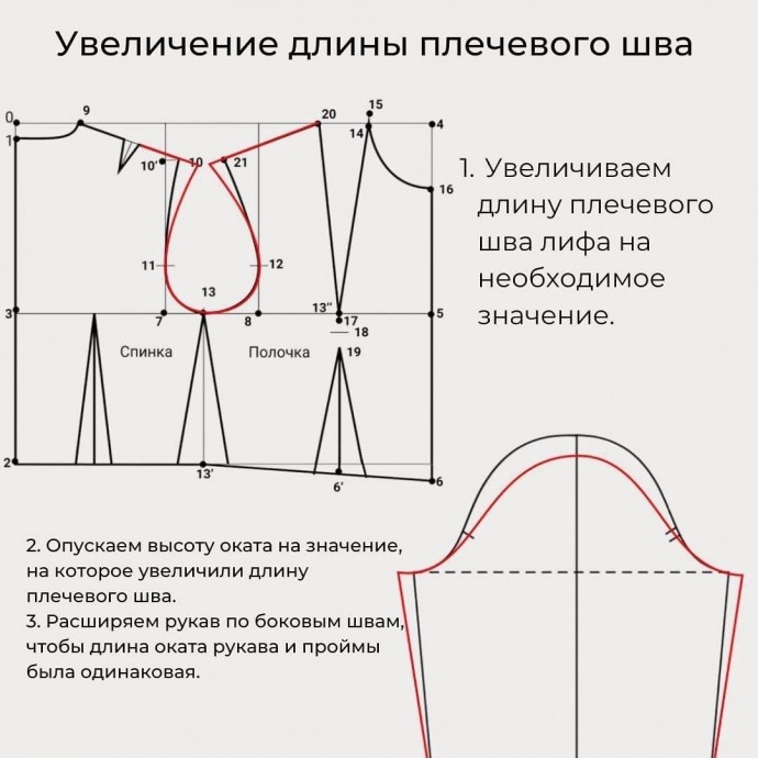 В таком случае, удлиняя плечевой шов на определённое значение, вам необходимо опустить высоту оката рукава и расширить его по боковым швам.