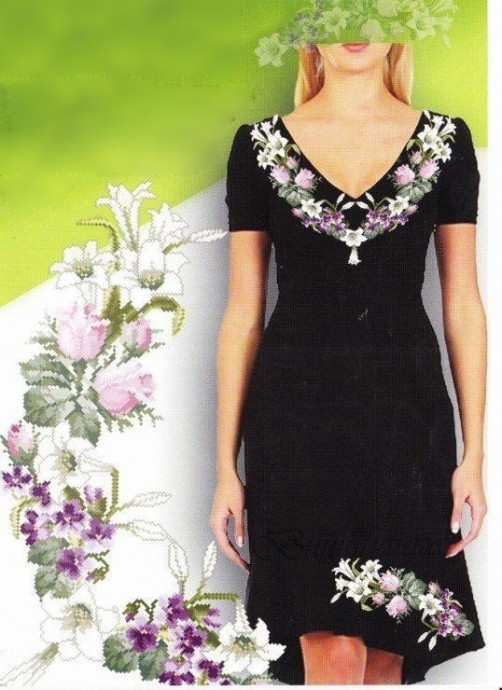Вышивка горловины розами и лилиями это красивый вариант для вечеринок и праздников.