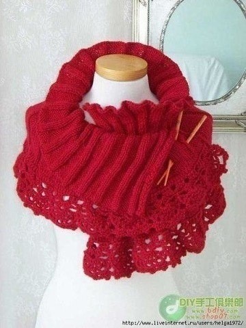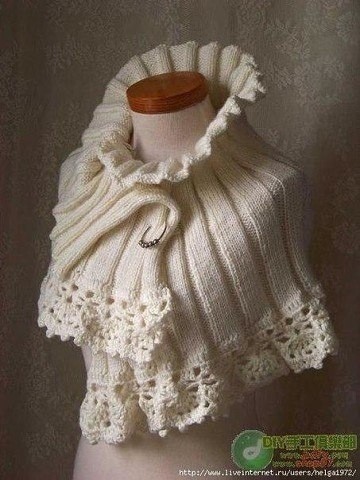 Накидка, связанная спицами и крючком, становится интересной, если ее заколоть декоративной булавкой.