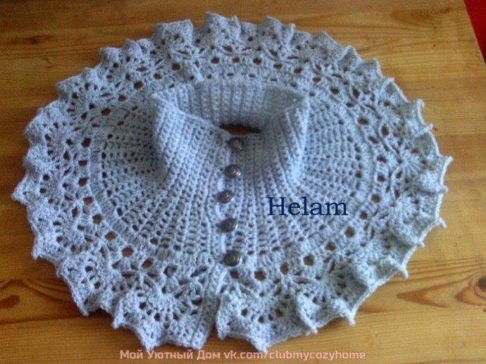 Затем провязала ряд столбиков без накида и выполнила пико из 3 возд. петель над 2 возд. петлями (по 3 пико на мотив). Распределить и пришить 5 пуговиц, вывязать для них петли на другой стороне.